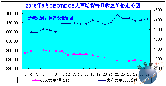 根据慧通农牧信息资讯的统计,2015年5月美豆期货震荡下跌,月底期间略有回升。USDA报告超预期利空,美豆种植进度良好,南美产量丰收等共同打压美豆期价,另外美国经济数据好坏参半,但加息信号进一步明确,进一步利空美豆期货市场。