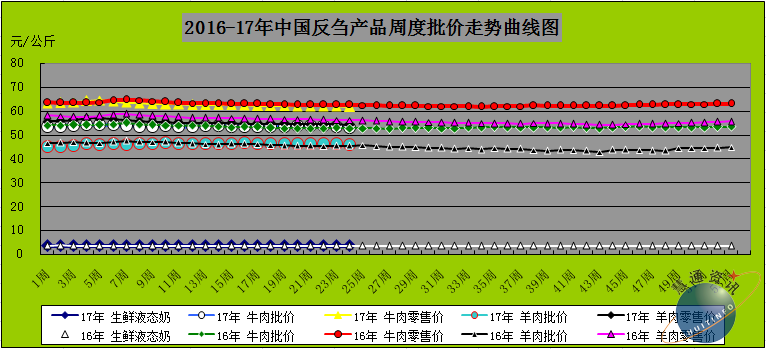反刍产品市场上,根据慧通数据研究部统计数据显示,2017年第24周全国生鲜液态奶周度均价3.42元/公斤,环比持稳,同比下跌0.29%;牛肉批发周度均价53.13元/公斤,环比下跌0.65%,同比上涨0.78%;牛肉零售周度均价61.71元/公斤,环比下跌0.19,同比下跌1.36%;羊肉批发周度均价46.02元/公斤,环比下跌0.26%,同比上涨1.28%;羊肉零售周度均价54.24元/公斤,环比下跌0.09%,同比下跌3.33%。