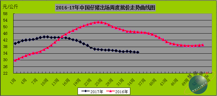 图表一,2016-17年中国生猪/仔猪周度加权均价比较曲线图(单位元公斤):