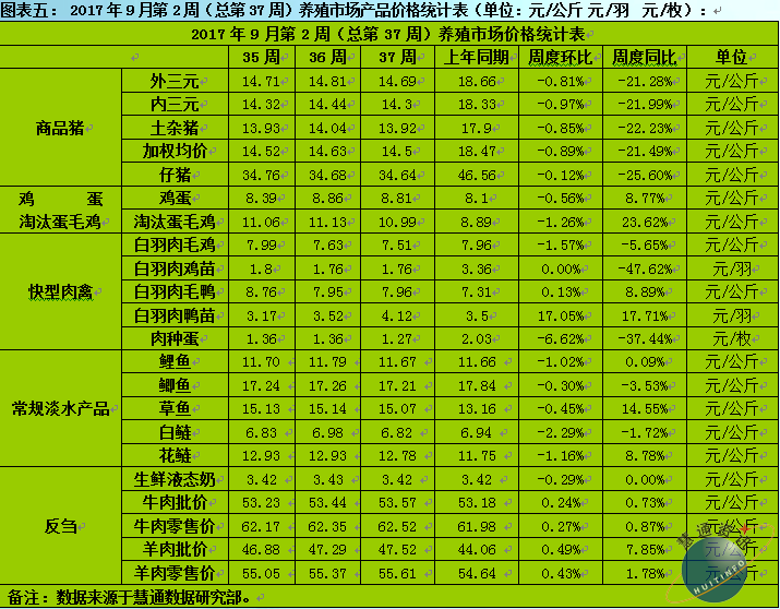 在2017年9月第2周 (9月11日-9月17日总第37周),节前备货提振有限,市场需求恢复仍缓慢。生猪方面,本周生猪价格环比下跌;禽蛋产品中,本周鸡蛋价格及淘汰蛋毛鸡价格下跌;肉禽产品中,白羽肉毛鸡价格下跌,白羽肉鸡苗价格持稳,肉种蛋价格下跌,白羽肉毛鸭价格小幅上涨,白羽肉鸭苗价格持续涨势;水产品方面,淡水鱼产品价格持续慢跌;反刍产品方面,本周反刍产品中除奶产品价格小幅下调外,牛羊肉批零价格持续小幅上涨。