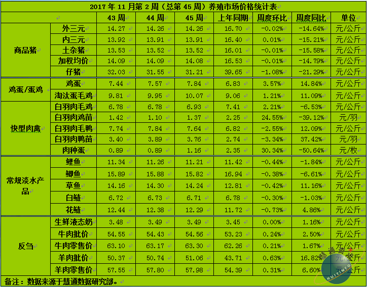 生猪价格方面,根据慧通数据研究部的统计数据显示,2017年第45周出栏商品大猪均价环比下跌,其中出栏外三元大猪周度均价14.26元/公斤,环比下跌0.02%,同比下跌14.64%;出栏内三元大猪周度均价13.91元/公斤,环比上涨0.01%,同比下跌15.21%;出栏土杂大猪周度均价13.52元/公斤,环比下跌0.01%,同比下跌15.58%;外三元、内三元及土杂猪周度加权均价14.08元/公斤,环比下跌0.01%,同比下跌14.79%;仔猪周度均价31.21元/公斤,环比下跌1.08%,同比下跌21.29%。