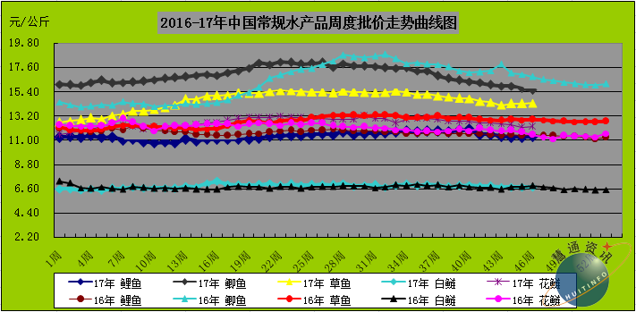 图表三:2016-17年中国常规淡水鱼周度批价比较曲线图(单位元公斤):