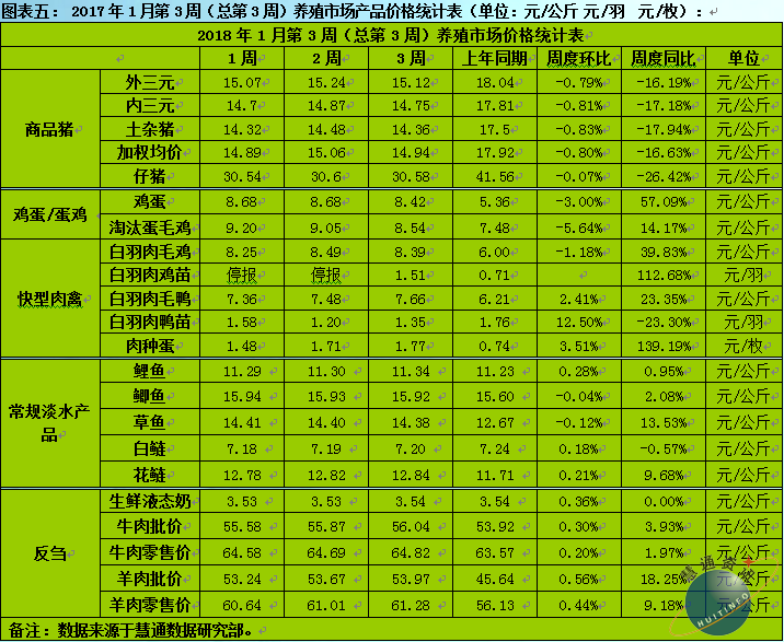生猪价格方面,根据慧通数据研究部的统计数据显示,2018年第3周出栏商品大猪均价环比下跌,其中出栏外三元大猪周度均价15.12元/公斤,环比下跌0.79%,同比下跌16.19%;出栏内三元大猪周度均价14.75元/公斤,环比下跌0.81%,同比下跌17.18%;出栏土杂大猪周度均价14.36元/公斤,环比下跌0.83%,同比下跌17.94%;外三元、内三元及土杂猪周度加权均价14.94元/公斤,环比下跌0.80%,同比下跌16.63%;仔猪周度均价30.58元/公斤,环比下跌0.07%,同比下跌26.42%。