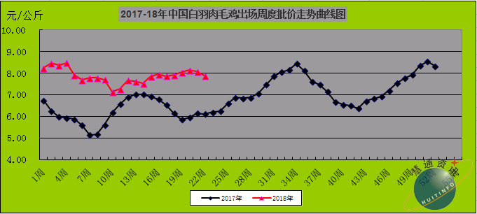家禽产品市场上,根据慧通数据研究部初统数据显示,2018年第22周全国商品鸡蛋周度均价6.96元/公斤,环比上涨0.43%,同比上涨70.17%;淘汰蛋鸡周度均价7.70元/公斤,环比下跌1.16%,同比上涨73.42%;出栏白羽肉毛鸡出场周度批发均价7.88元/公斤,环比下跌2.72%,同比上涨28.76%;白羽肉鸡苗出厂批价为2.39元/羽,同比上涨3.46%,环比上涨408.51%;白羽肉毛鸭出场批发周度均价8.00元/公斤,环比下跌0.37%,同比上涨31.15%;白羽肉鸭苗出场批发周度均价3.45元/羽,环比下跌6.76%,同比上涨430.77%;肉种蛋市场周度价格1.49元/枚,同比下跌4.49%,环比上涨181.13%。