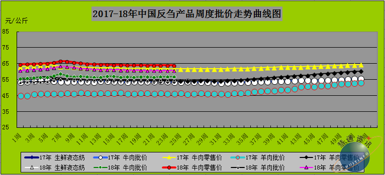 反刍产品市场上,根据慧通数据研究部初统数据显示,2018年第24周全国生鲜液态奶周度均价3.39元/公斤,环比持平,同比下跌0.88%;牛肉批发周度均价56.86元/公斤,环比上涨0.25%,同比上涨6.58%;牛肉零售周度均价63.95元/公斤,环比上涨0.13%,同比上涨3.41%;羊肉批发周度均价54.90元/公斤,环比上涨0.16%,同比上涨18.81%;羊肉零售周度均价60.69元/公斤,环比上涨0.10%,同比上涨11.81%。