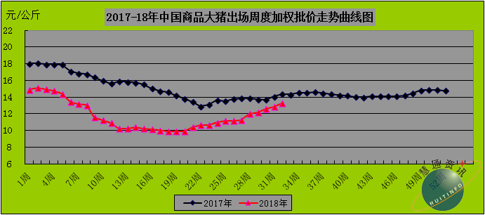 生猪价格方面,根据慧通数据研究部初统数据显示,2018年第32周出栏商品大猪均价环比上涨,其中出栏外三元大猪周度均价13.40元/公斤,环比上涨2.76%,同比下跌7.90%;出栏内三元大猪周度均价13.03元/公斤,环比上涨2.84%,同比下跌7.98%;出栏土杂大猪周度均价12.65元/公斤,环比上涨2.93%,同比下跌7.93%;外三元、内三元及土杂猪周度加权均价13.22元/公斤,环比上涨2.80%,同比下跌7.94%;仔猪周度均价24.88元/公斤,环比上涨0.24%,同比下跌29.10%。